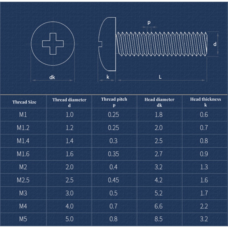 Bảng Thông Số Kỹ Thuật Vít Đầu Tròn Chữ Thập Màu Đen m3 m3.5 m4 m5:
