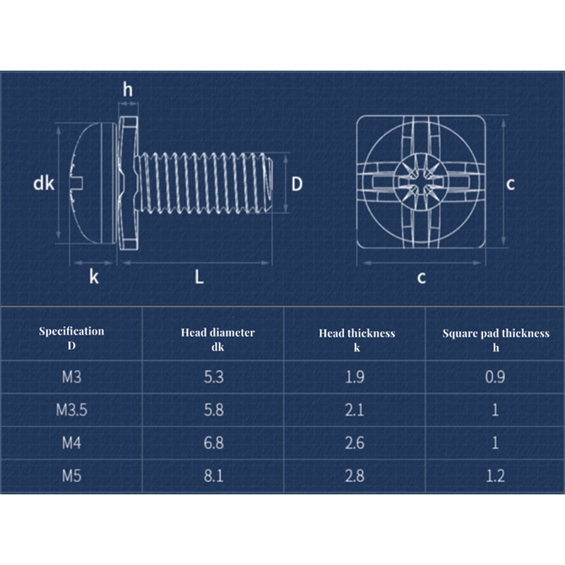 Bảng Thông Số Kỹ Thuật Vít Packe Tròn Có Long Đen Vuông M3 M3.5 M4 M5: