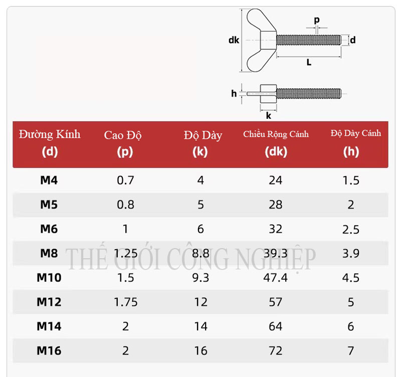 Vít tay vặn kiểu cánh bướm (hay còn gọi là bu lông tai dê, bu lông bướm) có thiết kế đặc biệt với phần đầu hai cánh vặn dễ thao tác bằng tay. Sản phẩm bao gồm: