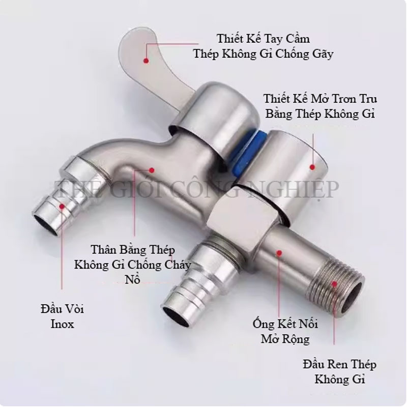 Vòi Nước Inox 304 Tay Gạt Hổ – Hai Cửa Ra, Xả Nhanh, Đầu Vào Phi 21mm