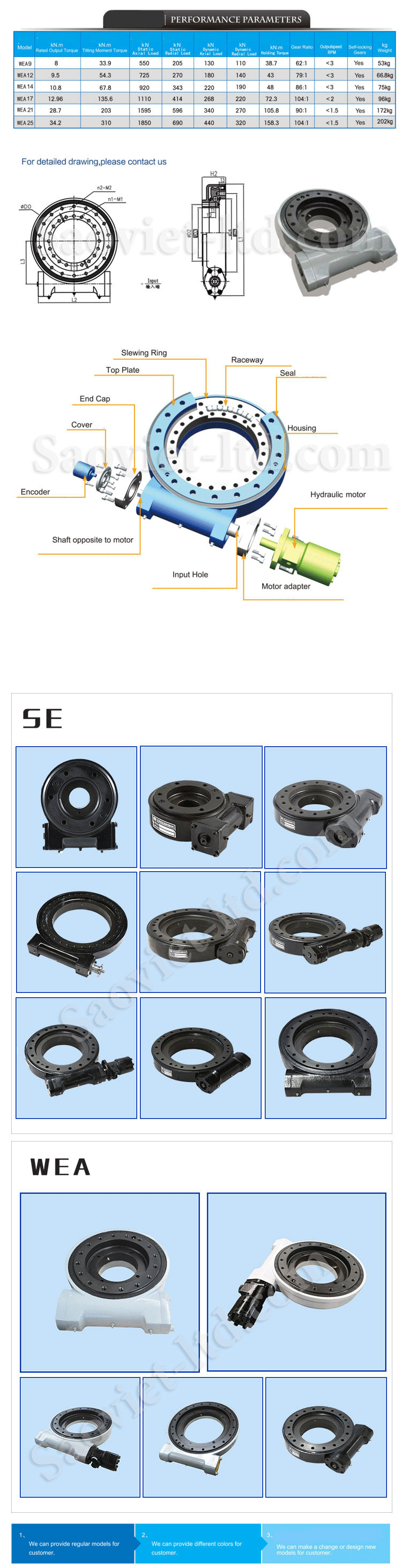 Ổ đĩa quay: loại mở ( sê-ri S ), loại hàng rào ( sê -ri SE ) , giun kép ( sê-ri S / SE-2 ) , loại dọc ( sê-ri V ) và loại trục kép ( sê-ri SD ), và theo công nghệ của khách hàng Nó là cần thiết để thiết kế các sản phẩm của bất kỳ thông số kỹ thuật và cấu trúc. Sản phẩm được sử dụng rộng rãi trong máy móc xây dựng, máy móc xây dựng, luyện kim và máy móc khai thác, máy móc cảng tàu, sản xuất điện gió và các ngành công nghiệp khác.