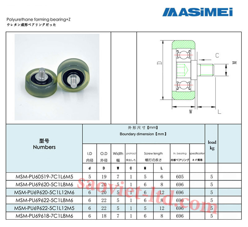 Bảng Thông Số Vòng Bi Bọc Nhựa PU Cọc Vít M5-M6