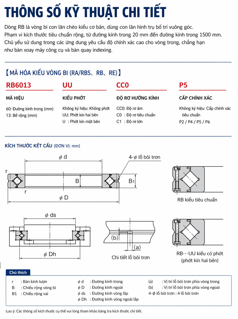 - Kiểu: RB tiêu chuẩn, có thể tùy chọn UU (phớt kín 2 bên)