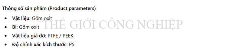 Vòng trong và vòng ngoài làm bằng gốm oxit nhôm (ZrO₂) hoặc vật liệu kết hợp gốm – thép (hybrid). Bi cầu bằng gốm có độ cứng cao, nhẹ và chịu nhiệt tốt. Lồng giữ bi (cage) thường sử dụng PTFE hoặc PEEK, có khả năng chịu mài mòn và hóa chất. Độ chính xác sản xuất đạt chuẩn P5, đảm bảo hoạt động êm và ổn định ở tốc độ cao.