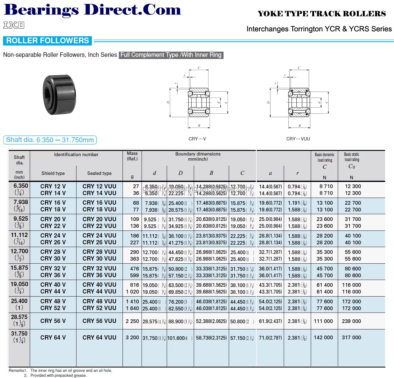Vòng bi IKO CRY12, CRY14, CRY16, CRY18, CRY20, CRY22, CRY24, CRY26, CRY28, CRY30, CRY32, CRY36 là dòng con lăn cam follower (cam yoke roller) độ chính xác cao, được thiết kế cho các cơ cấu dẫn hướng, cam cơ khí và hệ thống chuyển động tuyến tính yêu cầu tải trọng lớn và độ bền cao. Sản phẩm thuộc thương hiệu IKO (Nhật Bản), nổi tiếng về độ chính xác và tuổi thọ vận hành.