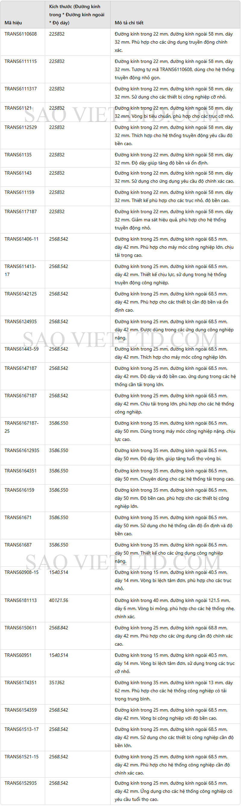 TRANS 61659: thuộc cùng dòng vòng bi lệch tâm, thông số tương đương các mã trên (thường dùng trong cụm giảm tốc trung bình – tải vừa).