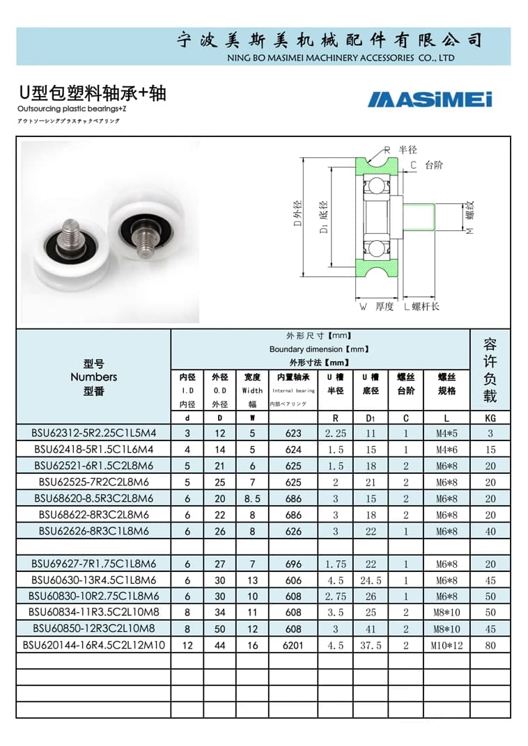 Bảng thông số vòng bi nhựa ròng rọc rãnh U BSU60630-13C1L8M6