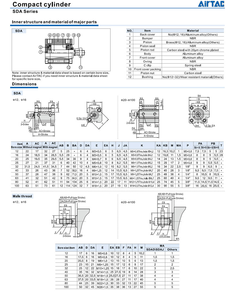 Dòng xi lanh SDA inox 304 có nhiều kích thước đường kính piston gồm 20mm, 25mm, 32mm, 40mm, 50mm, 63mm và 80mm, cho phép lựa chọn phù hợp với từng yêu cầu lực đẩy khác nhau trong hệ thống máy. Hành trình xi lanh có thể lựa chọn linh hoạt từ 5mm đến khoảng 120mm, đáp ứng nhiều ứng dụng truyền động tuyến tính trong các thiết bị cơ khí và tự động hóa.