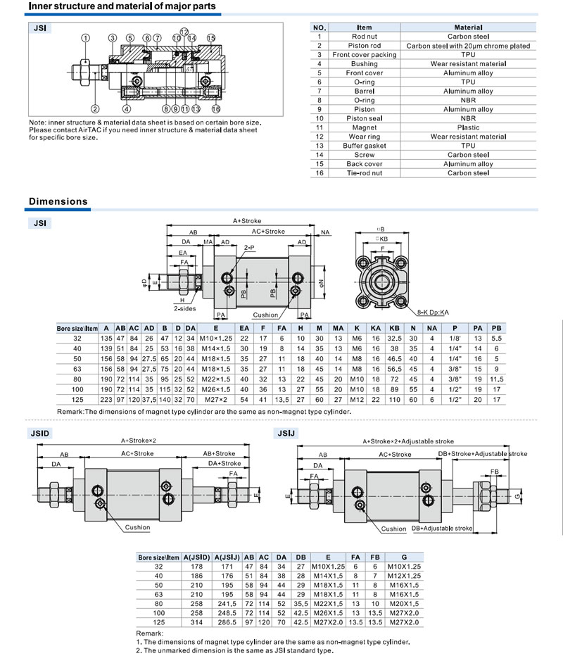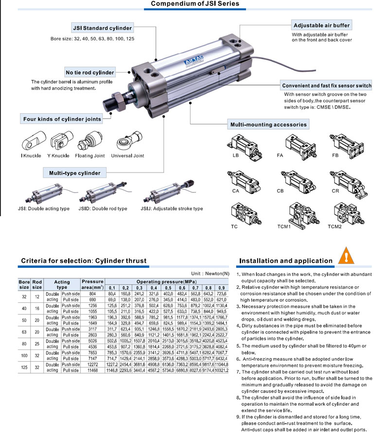 Xi lanh khí nén JSI có đường kính piston từ 32mm đến 125mm gồm các model phổ biến như JSI32, JSI40, JSI50, JSI63, JSI80, JSI100 và JSI125. Hành trình xi lanh có thể lựa chọn linh hoạt từ 25mm đến khoảng 1000mm hoặc lớn hơn tùy theo yêu cầu của hệ thống máy. Áp suất làm việc thông thường nằm trong khoảng 0.1 – 1.0 MPa, áp suất thử có thể đạt 1.5 MPa, đảm bảo khả năng vận hành ổn định và an toàn. Tốc độ chuyển động của piston có thể đạt 30 – 800 mm/s, tùy thuộc vào kích thước xi lanh và điều kiện làm việc.