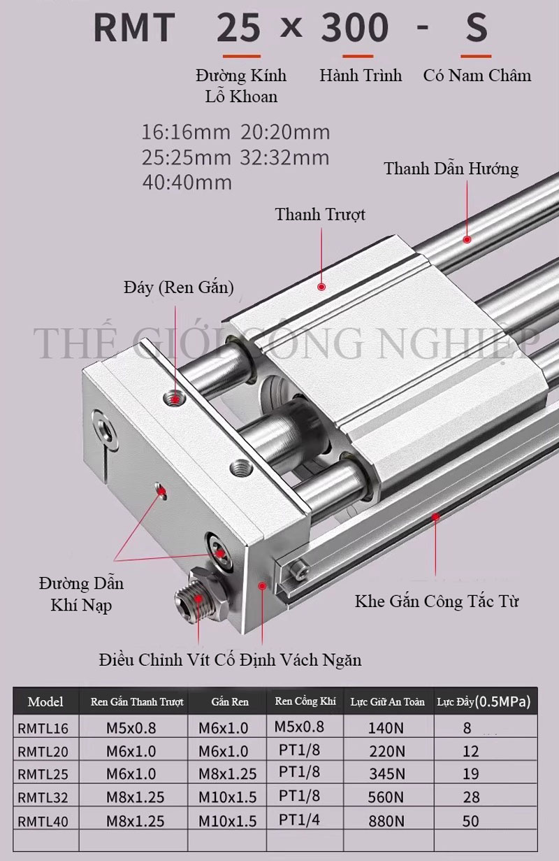 Mô Tả Chi Tiết: Xi Lanh Không Trục Dẫn Hướng Từ Tính Kiểu Airtac RMT10/16/20/25/32/40