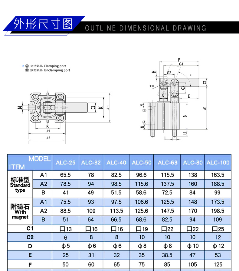 THÔNG SỐ KỸ THUẬT XI LANH KIỂU ĐÒN BẨY ALC25, ALC32, ALC40, ALC50, ALC63, ALC80, ALC100