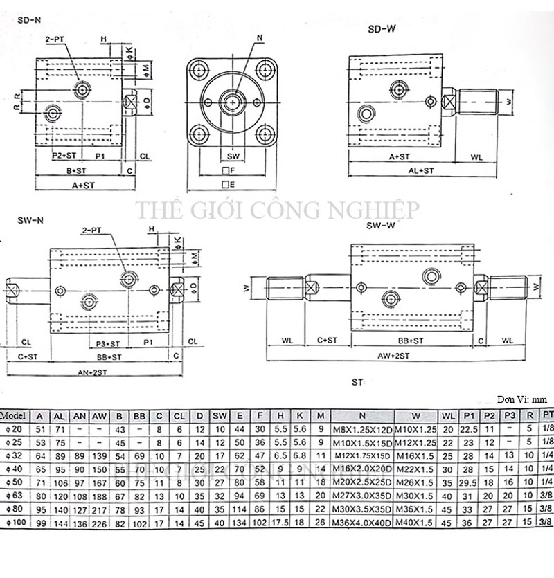 - Model: SD20, SD25, SD32, SD40, SD50 (tương ứng với đường kính piston 20mm, 25mm, 32mm, 40mm, 50mm).