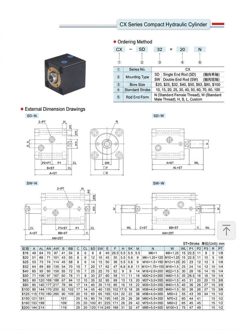Xi lanh thủy lực vuông CX-SD / JOB / CHTB là dòng xi lanh dạng khối (square block cylinder) chuyên dùng trong máy ép, khuôn dập và hệ thống thủy lực công nghiệp. Thiết kế thân vuông nhỏ gọn, độ cứng vững cao, phù hợp lắp đặt trong không gian hạn chế nhưng vẫn đảm bảo lực ép lớn và độ ổn định cao.