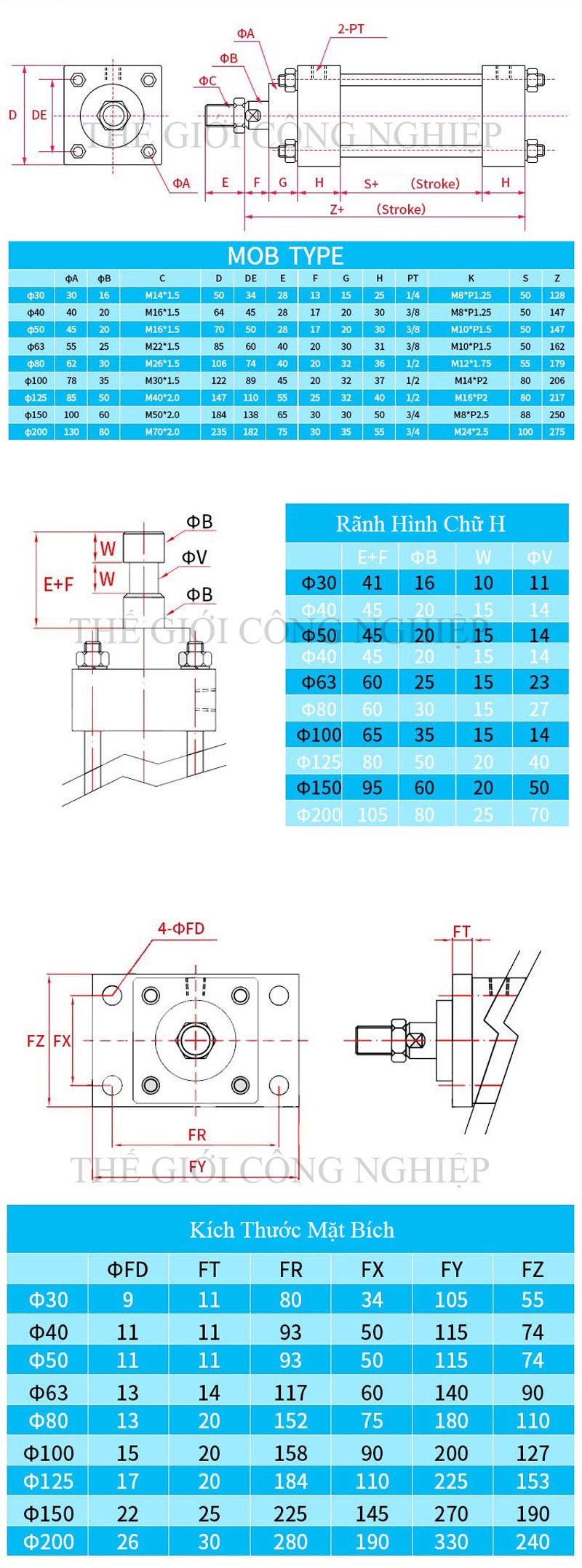 Xy lanh khí nén MOB-FB là dòng sản phẩm tiêu chuẩn chất lượng cao, được chế tạo để đáp ứng yêu cầu khắt khe trong truyền động công nghiệp. Sản phẩm có đường kính đa dạng từ 30mm, 40mm, 50mm, 63mm, 80mm, 100mm đến 125mm, kết hợp hành trình tùy chọn từ 20mm đến 500mm, cho phép người dùng linh hoạt ứng dụng trong nhiều hệ thống máy móc.